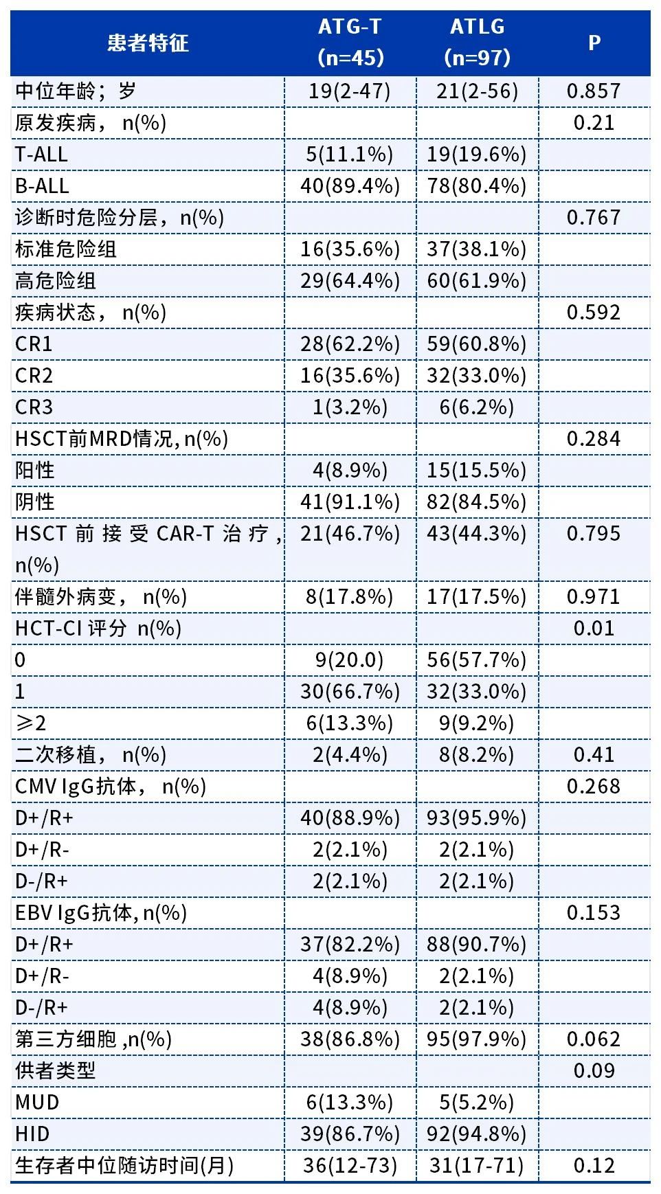 我们的分析涵盖了总共142名接受来自配型半相合(HID)(n=11)或非血缘相合供者(MUD)(n=131)造血干细胞移植的ALL患者。中位年龄为19岁(范围:2~56岁)。所有患者接受了以TBI(总剂量1200cGy,200cGy bid 3天)为基础的清髓预处理方案,其中97名患者接受了ATLG(总剂量20 mg/kg,分为四天);45名患者接受了ATG-T(总剂量6.5~7.5 mg/kg,分为四天)用于预防GVHD。该研究的受试者包括急性T淋巴细胞白血病(T-ALL,n=24)和急性B淋巴细胞白血病(B-ALL,n=118)患者,根据诊断时情况被分为标危组(n=53)和高危组(n=89)组(表1)。