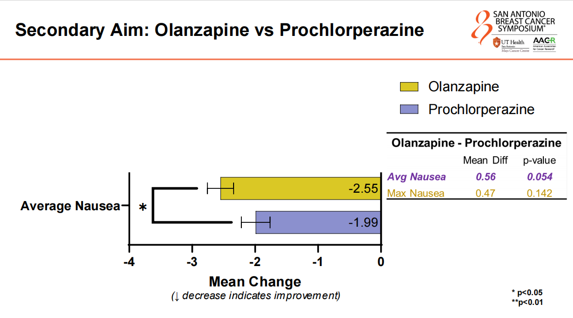 Prof.Luke Peppone:So in terms of safety profile,both of those drugs were excellent,and we had no serious adverse events related to the study intervention drugs,either olanzapine or prochlorperazine.We had a number of adverse events that were all expected.Olanzapine is known to cause sedation and some drowsiness,and those were the typical adverse events that we dealt with,similar with prochlorperazine,but nothing unexpected.And adverse events between the placebo and the study interventions were very similar.We’re still teasing apart those,but the safety profile of those two drugs in our study and in previous research are excellent,and that’s one of the many reasons why they were chosen,and we like using these drugs in these patients.