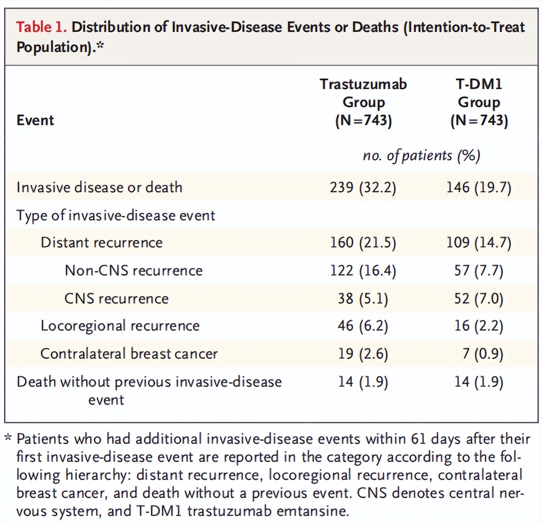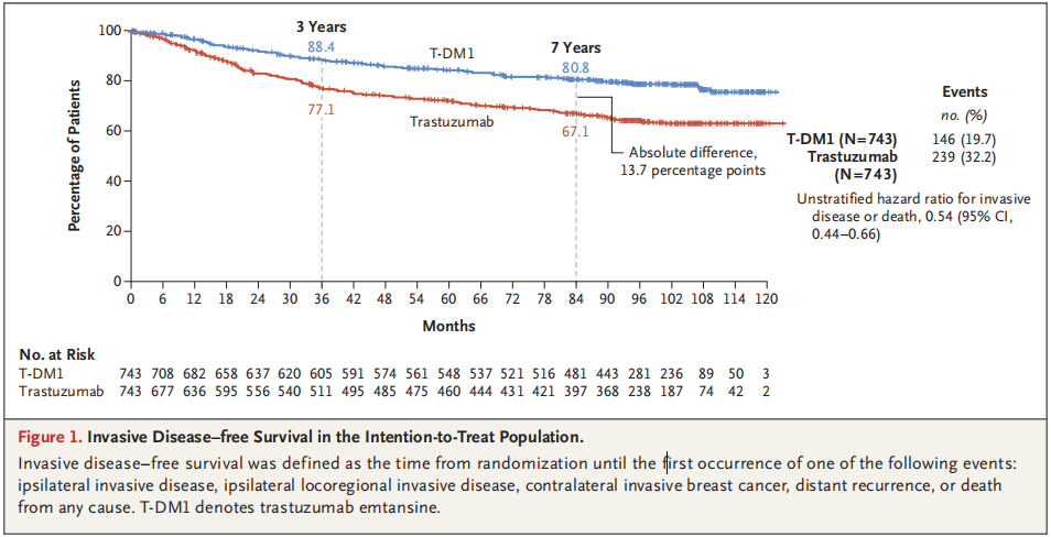 T-DM1组和曲妥珠单抗组的中位随访时间分别为101.4个月(范围:0.1~123.3)和100.8个月(范围:0.1~122.8)。意向治疗人群包括每组743例患者。安全性分析人群中,T-DM1组包括740例患者,曲妥珠单抗组包括720例患者。