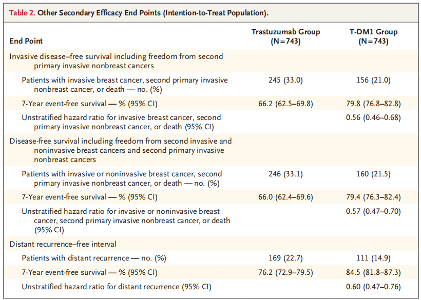 无浸润性疾病生存期(包括第二原发性非乳腺癌)、无病生存期和无远处复发间期的结果均表明,T-DM1优于曲妥珠单抗(表2)。