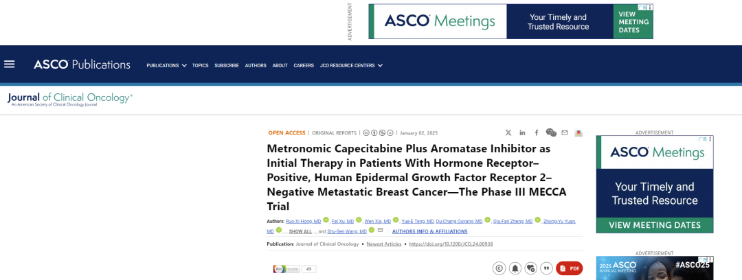 1、Hong,Ruo-Xi et al.“Metronomic Capecitabine Plus Aromatase Inhibitor as Initial Therapy in Patients With Hormone Receptor-Positive,Human Epidermal Growth Factor Receptor 2-Negative Metastatic Breast Cancer-The Phase III MECCA Trial.”Journal of clinical oncology:official journal of the American Society of Clinical Oncology,JCO2400938.2 Jan.2025,doi:10.1200/JCO.24.00938