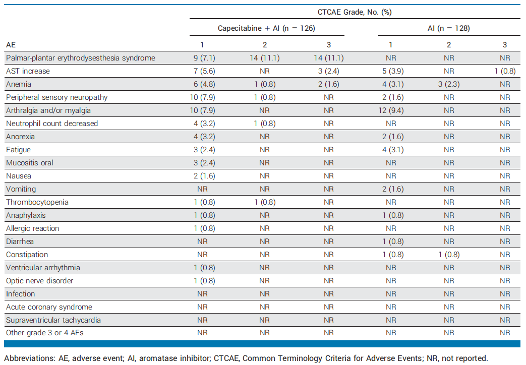 研究结果:共263例患者被随机分配,其中254例患者构成了全分析集。中位随访时间50.7个月时,发生了203例PFS事件。节拍卡培他滨+AI组的中位PFS为20.9个月,而单药AI组为11.9个月(HR,0.58;95%CI:0.43~0.76)。