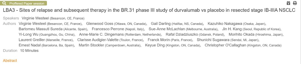 可切除的Ib-IIIa期非小细胞肺癌患者,度伐单抗或安慰剂维持治疗后,复发位置及后续治疗(BR.31研究)