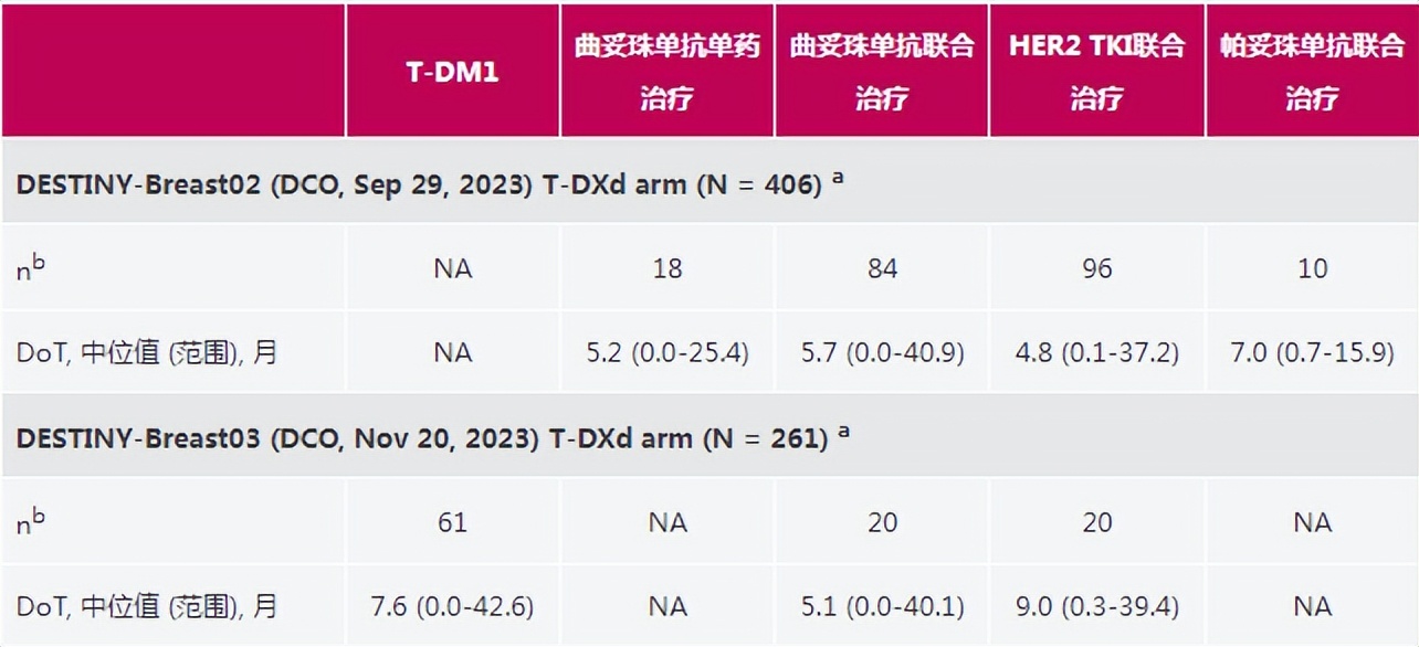 在DESTINY-Breast03中为T-DM1(n=61)、曲妥珠单抗联合治疗(n=20)和HER2 TKI联合治疗(n=20),其中位DoT分别为7.6、5.1、5.2和9.0个月。