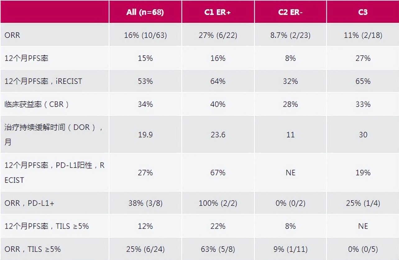 另一项来自澳大利亚的单臂II期BCT1703 DIAmOND研究[4],评价了曲妥珠单抗联合tremelimumab(一种靶向组织因子的抗体偶联药物)和度伐利尤单抗(抗PD-L1免疫检查点抑制剂)用于至少接受过一线晚期治疗的HER2+mBC曲妥珠单抗耐药患者的疗效和安全性。该研究包括3个队列:队列1(C1)为ER+(≥1%)患者,队列(C2)为ER阴性(<1%)患者,接受tremelimumab 75mg联合度伐利尤单抗1500mg每4周一次(Q4W),曲妥珠单抗2mg/kg每1周一次(Q1W)治疗12周,之后继续每3周一次(Q3W)度伐利尤单抗1120mg和曲妥珠单抗6mg/kg;队列3(C3)不区分ER状态,接受单剂量tremelimumab 300mg,以及持续(Q3W)的度伐利尤单抗1120mg和曲妥珠单抗6mg/kg联合治疗。研究结果如下表所示,总体人群的ORR为16%,其中PD-L1+和TILS≥5%患者的ORR分别为38%和25%。ER+患者的疗效较为亮眼,三个人群的ORR分别为27%、100%和63%。安全性方面,≥3级不良事件(C1/C2为66%,C3为53%)和特别关注的不良事件(C1/C2为66%,C3为68%)与已知毒性一致。