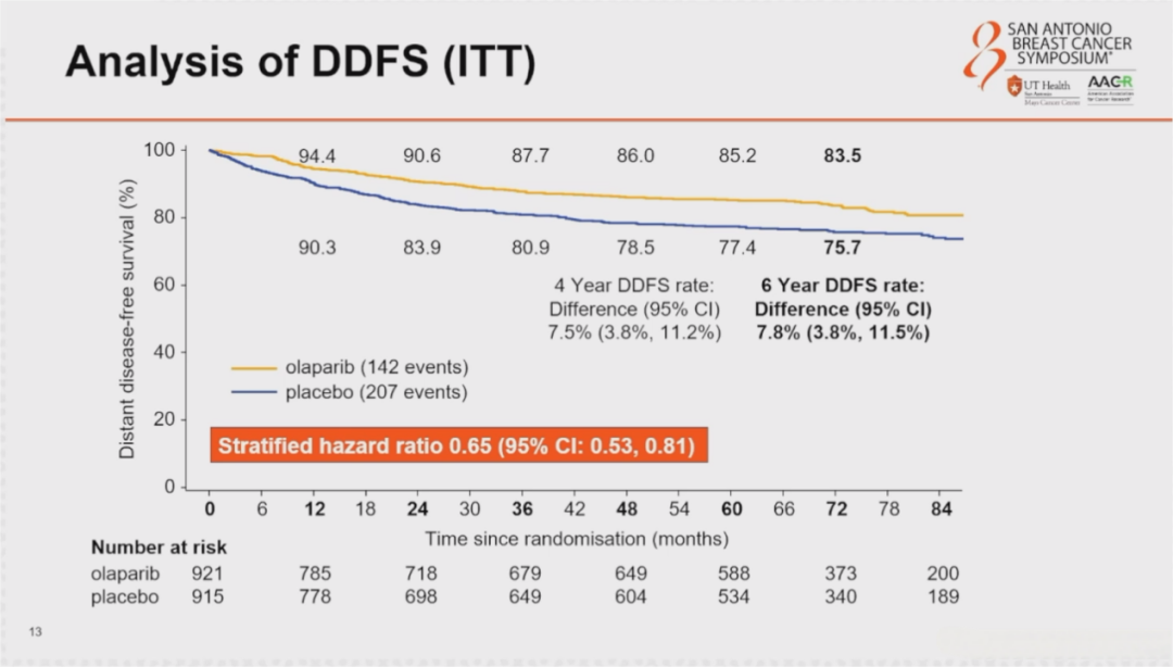 免疫治疗、HER2靶向治疗、CDK4/6抑制剂(用于激素受体<hr/>阳性乳腺癌)和PARP抑制剂(用于BRCA突变型乳腺癌)等新型治疗方法在年轻患者中的疗效可能与老年患者相当。然而,临床试验通常纳入的年轻患者数量相对较少,因此,很难在这一亚组中获得相关临床证据。一个例外是对于高风险、HER2阴性早期乳腺癌且携带BRCA1/2胚系突变患者开展的的III期OlympiA试验(NCT02032823);该研究将900多名中位年龄为42岁的患者随机分组,在完成标准治疗后接受奥拉帕利辅助治疗。研究结果显示,与安慰剂组相比,服用奥拉帕利1年后,患者IDFS和DDFS显著延长(N Engl J Med.2021;384:2394–2405)。值得注意的是,这一生存获益在6年后仍持续存在,且未增加继发性骨髓增生异常综合征或急性髓系白血病的风险(SABCS 2024;SESS-1568)。