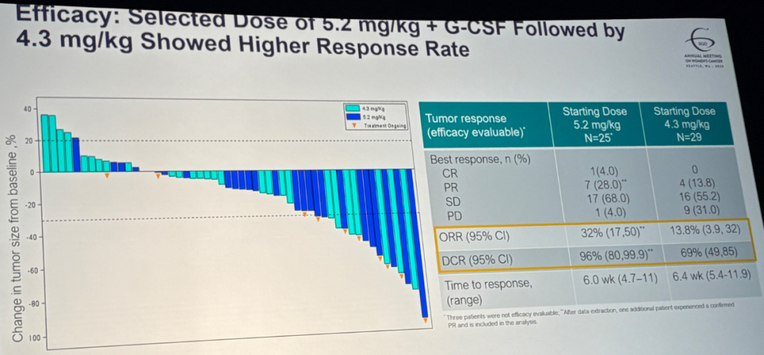 ◎从第一周期采用4.3mg/kg剂量组(n=29)的ORR为13.8%(95%CI:3.9%-32%),DCR为69%(95%CI:49%-85%)。最佳缓解率包括PR 13.8%、SD 55.2%和PD 31.0%。中位缓解时间为6.4周(范围:5.4-11.9周)。