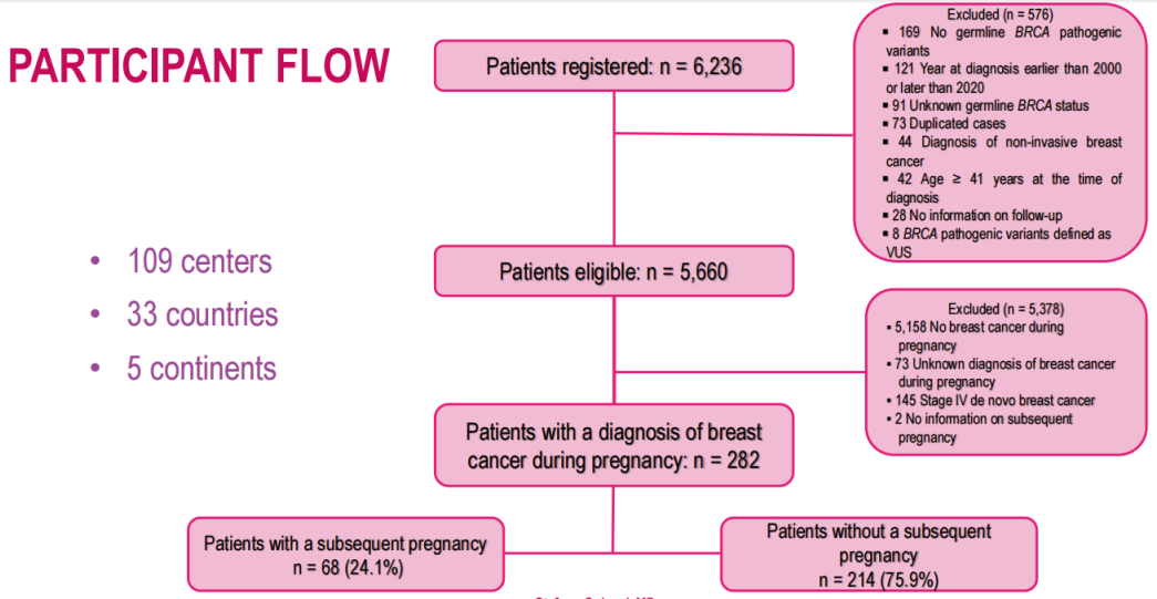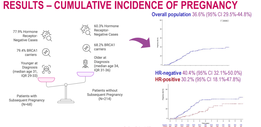 BRCA BCY研究(NCT03673306)是一项国际多中心的回顾性队列研究,纳入了2000年1月至2020年12月期间确诊为浸润性乳腺癌且年龄≤40岁的BRCA基因携带者,本分析仅纳入在妊娠期被确诊为乳腺癌的患者。将有后续妊娠事件的患者与无后续妊娠事件的患者进行比较。主要研究终点:后续妊娠的累积发生率、无病生存期(DFS)。次要终点:总生存期(OS)、胎儿和产科结局、首次DFS事件的模式。