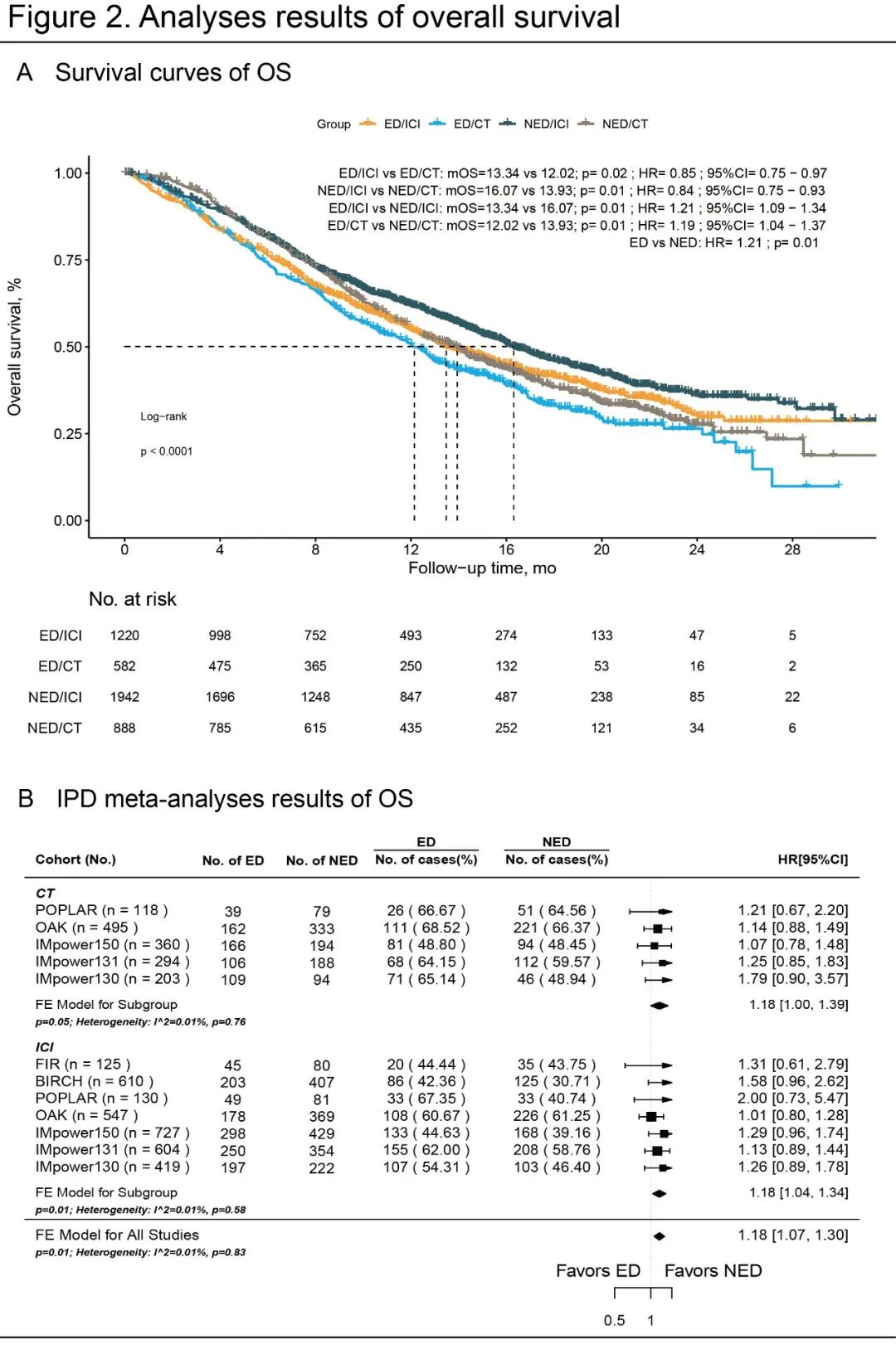然而,这篇涉及7项临床试验中共4632名患者的个体患者数据(IPD)荟萃分析提供的结果却显示,情绪困扰的影响并不限于免疫治疗的非小细胞肺癌患者。研究表明,即便是接受传统化疗的患者,情绪困扰依然是一个显著的负面预后因素。具体来说,无论患者接受免疫检查点抑制剂(ICIs)还是化疗(CT),情绪困扰患者的总生存期(OS)和无进展生存期(PFS)均明显低于未受情绪困扰的患者。这一结果打破了以往将情绪困扰与免疫治疗效果联系在一起的研究框架,提示情绪困扰不仅是免疫治疗中的重要生物标志物,也可能成为广泛适用于所有治疗方案中的预后性生物标志物。