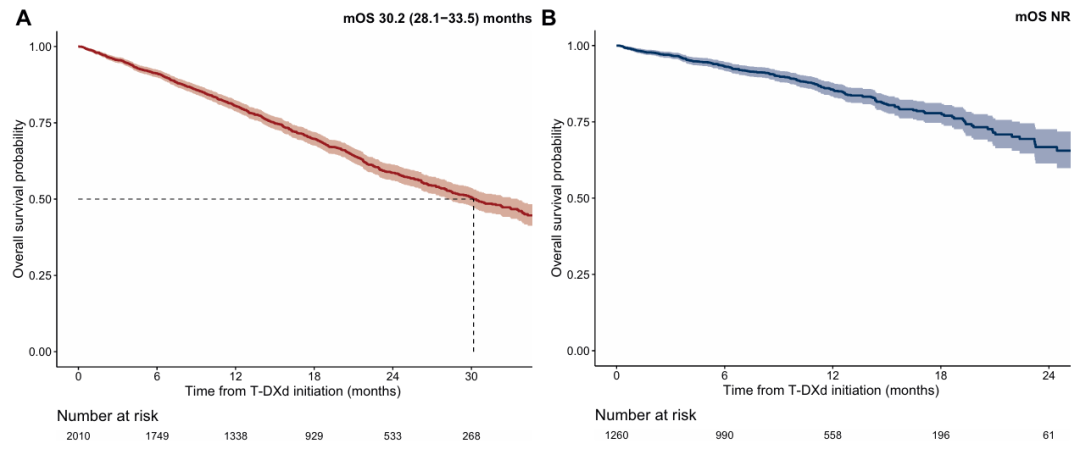 对于HER2+3L患者人群,中位随访时间为17.0个月(四分位数间距:9.6-24.7个月),期间749例(占比37.3%)死亡;这部分患者的中位OS为30.2个月(95%CI 28.1-33.5个月),一年生存率达80.5%(95%CI 78.7%-82.3%)。