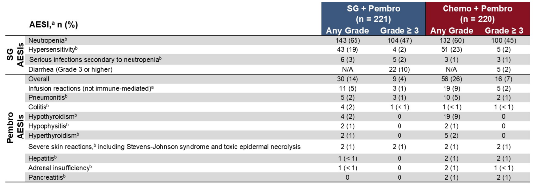 从ASCENT-04研究的安全性数据来看,SG联合免疫治疗并没有增加毒副作用,相反显示出相较于化疗组更好的治疗耐受性,表明该联合治疗方案的安全性是可控的。
