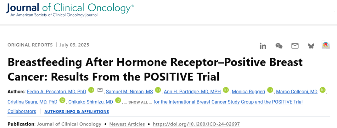 Peccatori FA,Niman SM,Partridge AH,et al.Breastfeeding After Hormone Receptor-Positive Breast Cancer:Results From the POSITIVE Trial.J Clin Oncol.Published online July 9,2025.doi:10.1200/JCO-24-02697