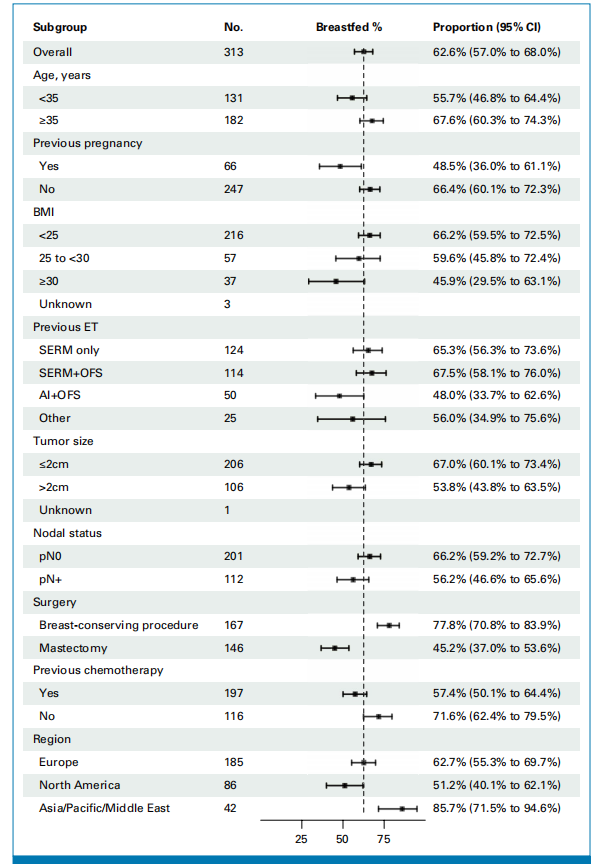 图3.不同患者特征下的哺乳比例(虚线表示总体哺乳率62.6%)