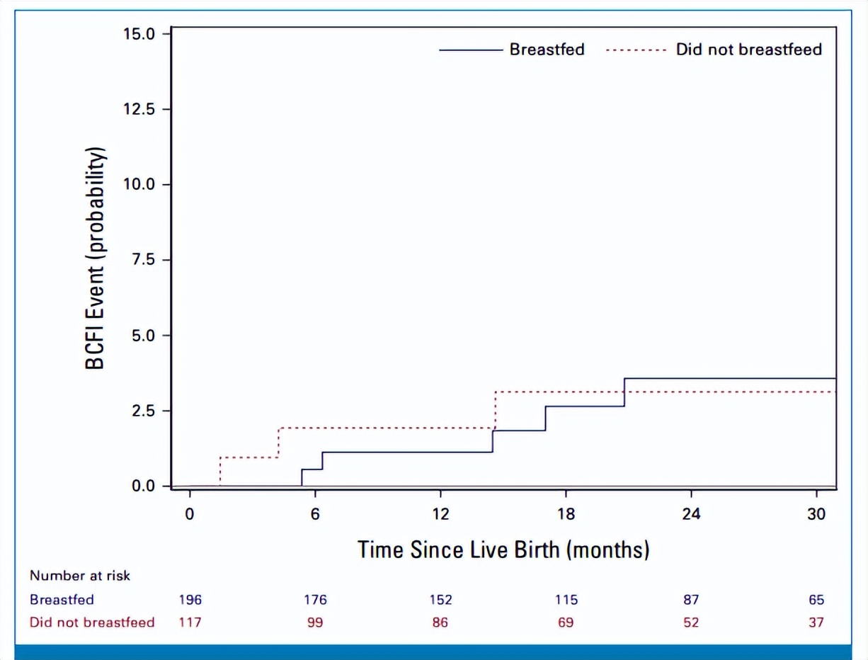 从首次活产开始中位随访22个月,未见母乳喂养者与非母乳喂养者BCFI事件差异。活产后12个月时,母乳喂养者BCFI事件发生率估计值为1.1%(95%CI 0.3%-4.4%);而非母乳喂养者为1.9%(95%CI 0.5%-7.5%)。活产后24个月时,母乳喂养者的BCFI事件估计发生率上升至3.6%(95%CI 1.5%-8.5%);非母乳喂养者则为3.1%(95%CI 1.0%-9.5%),两组间的绝对差值为0.4%(95%I-4.3%-5.2%),无统计学差异。