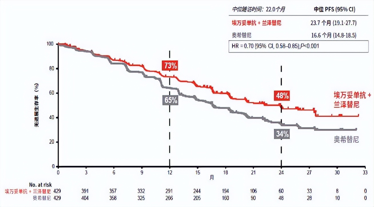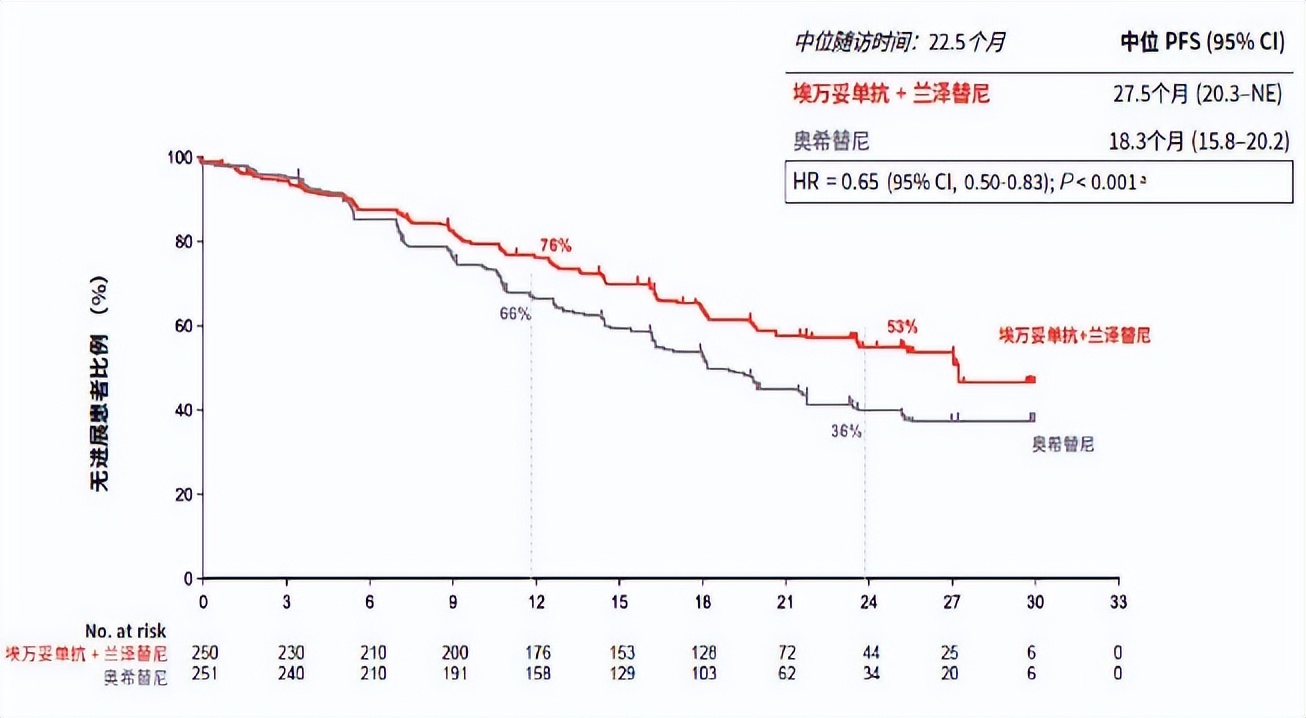 研究结果显示,对比奥希替尼单药组,埃万妥单抗联合兰泽替尼组的中位PFS显著延长(23.7个月vs.16.6个月;P<0.001),疾病进展或死亡风险降低30%(图2)。亚洲人群的疗效数据和全人群保持一致,且亚洲人群的mPFS在数值上更具优势,达到27.5个月[10](图3)。