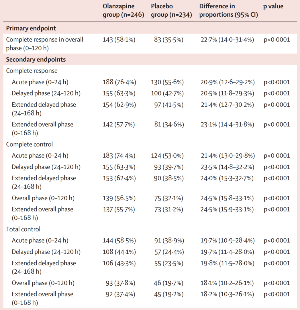 该研究纳入日本15家医院500例含蒽环方案治疗的乳腺癌患者,结果显示,奥氮平5mg组(246例)与对照组(234例)治疗期间全程(0-120h)全程完全缓解(CR:无呕吐+无解救用药率)为58.1%vs 35.5%,P<0.0001;在急性期(0-24小时)、延迟期(24-120小时)及延长的整体期(0-168小时)均显示出显著优势。至治疗失败时间(TTF:首次呕吐/解救药时间)为未达到vs 37.3h(HR=0.495,95%CI 0.385–0.635;P<0.0001)(表2)。安全性方面,奥氮平5mg组镇静相关副作用略有升高,但≥3级事件发生率低,未见锥体外系症状,安全可控。