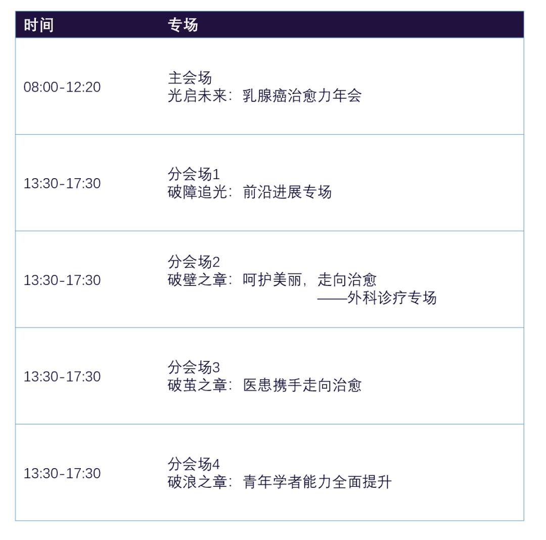 本次会议包括“光启未来:乳腺癌治愈力年会”主会场及乳腺癌前沿治疗专场、外科诊疗专场、医患对话专场、青年学者专场。