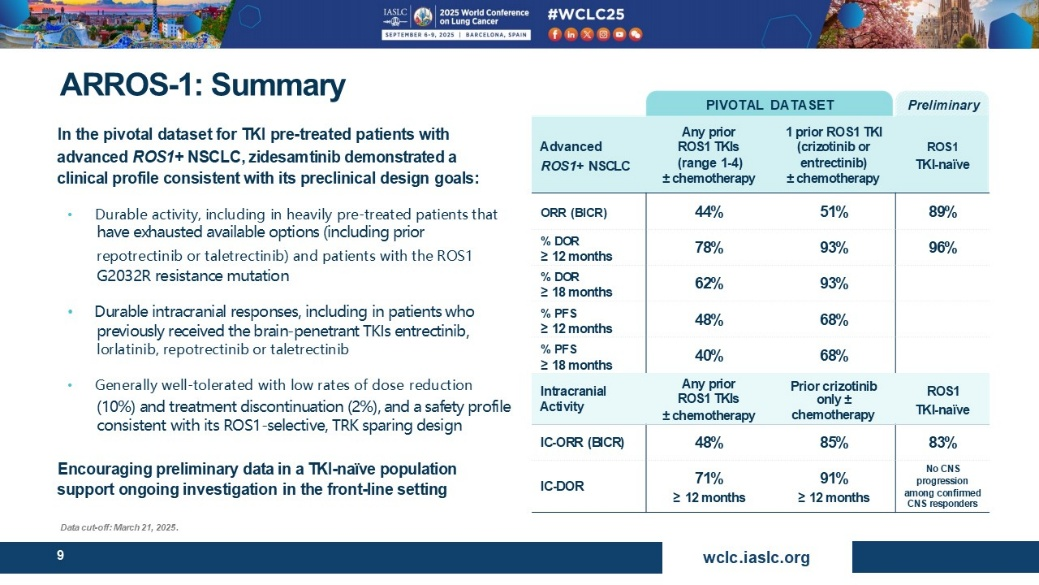 [1]A.E.Drilon,et al.Pivotal ARROS-1 Efficacy and Safety Data:Zidesamtinib in TKI Pre-treated Patients with Advanced/Metastatic ROS1+NSCLC.2025 WCLC.PL02.15.