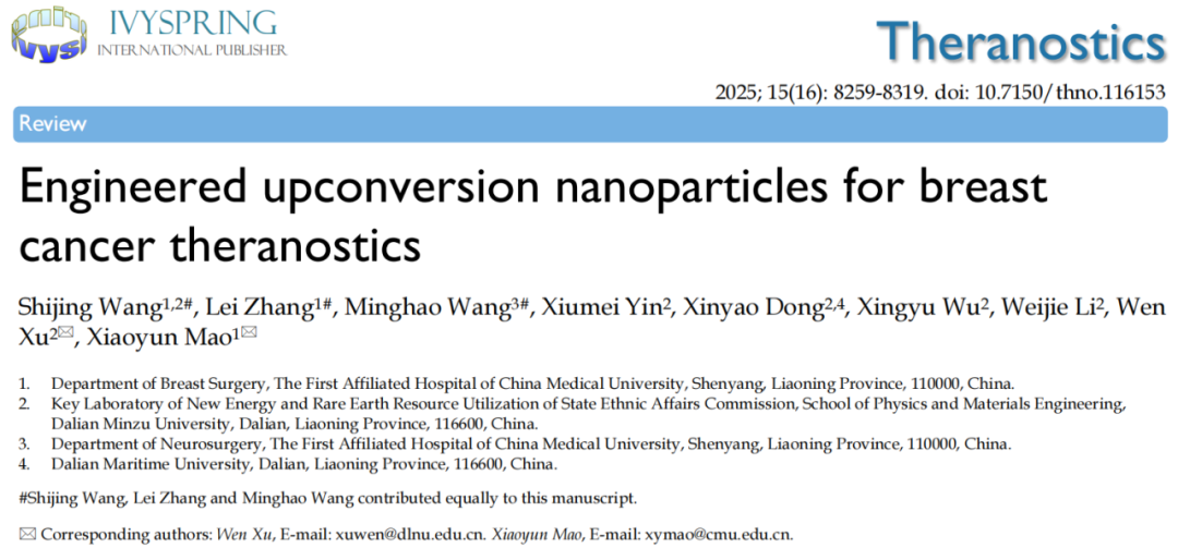编者按:乳腺癌是女性最常见的恶性肿瘤,发病率与死亡率居高不下,其异质性、耐药性及传统治疗的毒副作用,仍是临床面临的难题。近年来,稀土掺杂上转换纳米粒子(UCNPs)因其独特的光学特性、灵活的合成与功能化策略,在乳腺癌诊疗研究中受到广泛关注。近日,中国医科大学附属第一医院毛晓韵教授团队与大连民族大学徐文教授团队,在Theranostics发表封面综述《Engineered upconversion nanoparticles for breast cancer theranostics》。该综述系统总结了UCNPs在乳腺癌诊疗应用中的研究进展,并探讨了其临床转化挑战与未来发展方向。
