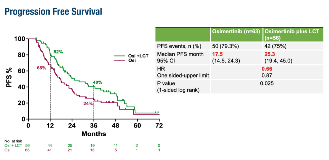 ☆奥希替尼联合LCT组的PFS为25.3个月,而单用奥希替尼组为17.5个月(风险比<hr/>0.66;p=0.025),疾病进展风险降低了34%。美国芝加哥大学的Marina Garassino在评论NorthStar试验主要终点PFS数据时表示:"NorthStar试验的数据极具启发性,数据表明,奥希替尼联合LCT为患者提供了另一种治疗选择。"