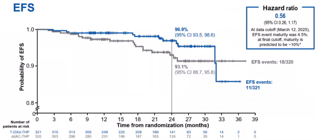 再者,T-DXd-THP组已经展现了积极的生存获益趋势,事件进展或死亡风险相较于对照组显著降低44%(EFS HR 0.56,95%CI:0.26–1.17),表明T-DXd-THP带来的显著pCR提升,已转化为显著的EFS生存获益。