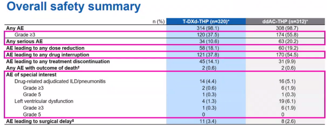 其中,T-DXd-THP的血液毒性、心脏毒性显著低于ddAC-THP,≥3级的中性粒细胞减少发生率仅为后者的三分之一(13.8%vs 34.6%),≥3级的左心功能不全仅为后者的六分之一(0.3%vs 1.9%)。在早期治疗中,T-DXd的间质性肺病/非感染性肺炎(ILD/p)发生率非常低,任意级别和≥3级事件仅分别为4.4%和0.6%,均大幅低于对照组(任意级别:4.4%vs 5.1%;≥3级:0.6%vs 1.9%)。