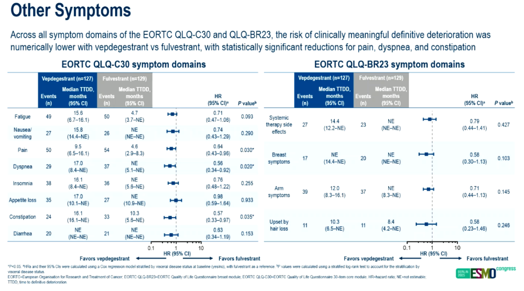 研究结果的临床意义尤为突出。一方面,Vepdegestrant与氟维司群均能维持患者健康相关生活质量(HRQoL),证实了Vepdegestrant在提升疗效的同时并未增加患者症状负担;另一方面,Vepdegestrant在PROs多维度指标的“至明确恶化的时间(TTDD)”上表现更优,意味着其能更久地延缓患者生活质量下降,这对于需长期管理的转移性乳腺癌患者而言是一项重要获益。