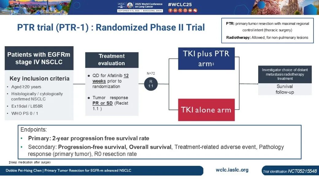 PTR研究旨在评估诱导治疗后对原发病灶行手术切除的疗效与安全性。研究纳入经组织病理学确认的局部晚期或转移性NSCLC患者,所有患者携带EGFR 19del或21L858R突变。符合入组条件的患者接受12周阿法替尼诱导治疗,全身评估为非进展者按1:1随机分组:一组继续接受TKI单药治疗,另一组接受原发病灶切除。研究主要终点为2年PFS率。