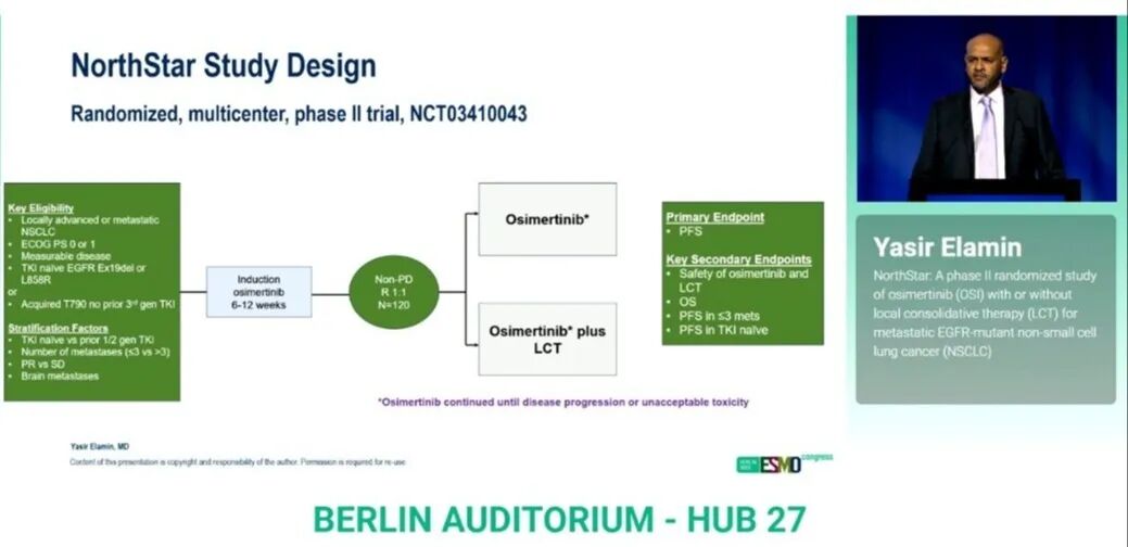 NorthStar是一项II期随机对照临床试验,旨在评估在标准奥希替尼治疗基础上联合局部治疗,是否能为携带EGFR敏感突变的晚期非小细胞肺癌(NSCLC)患者带来生存获益。研究纳入初治EGFR敏感突变晚期NSCLC患者,先接受6~12周奥希替尼诱导治疗,若最佳疗效评价为完全缓解(CR)、部分缓解(PR)或疾病稳定(SD),则按1:1随机分为两组:一组继续接受标准剂量奥希替尼治疗,另一组在此基础上联合局部治疗。主要研究终点为无进展生存期(PFS),次要终点包括总生存期(OS)和安全性等。