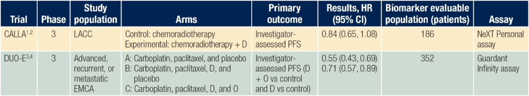 缩写:D,度伐利尤单抗;EMCA,子宫内膜癌;LACC,局部晚期宫颈癌;O,奥拉帕利;PFS,无进展生存期。