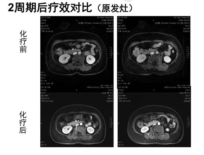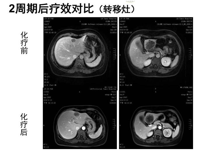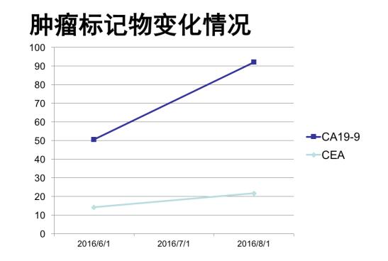 2周期后,与2016.6.29前片对比:肝左叶一肿块(较小者)较前增大,另外一病灶大小变化不明显,评效增大SD。肿瘤标记物水平持续升高。