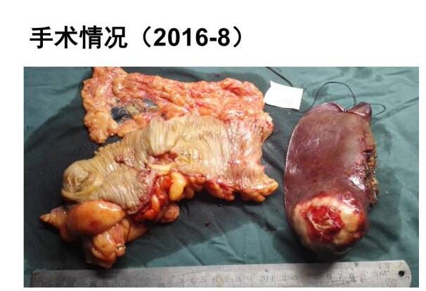 术后病理:右半结肠中低分化腺癌,累及浆膜,淋巴结可见癌转移2/18; 肝左外叶可见两枚转移灶,大者约6cm,符合肠癌肝转移。