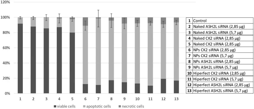 6. AnnexinV-PI凋亡分析。使用HA / PLL / Alb-Ser(2:1)NPs进行转染,凋亡率为77.2和87.3%(抑制ASH2L和CK2基因),而使用裸siRNA处理的细胞(使用更高的siRNA量,5.7μg),其凋亡率为14.1%和17.7%。