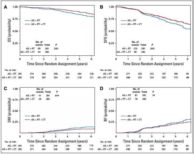 研究结果显示,AS+RT组4年总生存率为88.7%,6年总生存率为80.6%,而AS+RT+CT组4年总生存率为93.3%,6年总生存率为86%。化疗组相比对照组,降低31%的死亡风险(HR:0.69;95%CI,0.49-0.97;P=0.034)。对于次要研究终点,6年DSS统计数据,对照组为92.0%(95%CI,88.7%-94.9%),化疗组为93.4%(95%CI,89.1%-96.0%),两组无统计学差异(P=0.18).而对于6年DFS,平均DFS时间化疗组为8.5年,对照组为6.9年,DFS化疗组为65.4%,对照组为54.9,化疗组能够降低24%无疾病死亡风险(HR:0.76,95%CI,0.58-0.99%,P=0.043).而对于PSA无失败率来说,两组数据差别不大。