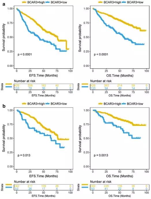 a.BCAR3高表达的多发性骨髓瘤患者有较高的EFS和OS(559个样本),而BCAR3低表达的患者有较低的EFS和OS(EFS: P < 0.0001, OS: P < 0.0001, Log-rank test)。