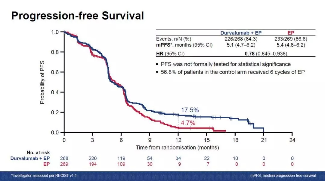 2、两组的PFS分别为5.1 vs 5.4个月,HR(95% CI)=0.78(0.645–0.936),没有p值。关于这部分我们如何看待?因为PFS不是主要终点,需要等到durva+treme+化疗组的OS报道出来才有分析PFS的价值,如果两个OS指标都达到终点,PFS才有评估的意义,如果其中一个没有达到终点,所有次要终点都变成描述分析。曲线在6个月后开始分开,说明免疫治疗的起效还是比较缓慢,对于快速进展的SCLC仍然需要联合化疗使肿瘤短期内得到控制。另外,PFS曲线在6个月后分离也间接说明免疫治疗对部分患者可以延长总生存,人群特征还需要细分,之前6个月的重合也许反应了这点。