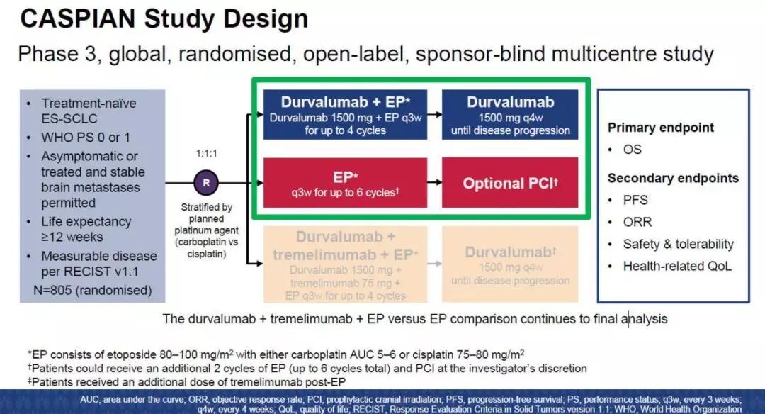 CASPIAN研究是一项随机、开放标签的全球多中心III期临床试验,针对的是广泛期SCLC患者的一线治疗,这项临床试验在全球22个国家的200多个中心进行,包括美国、欧洲、南美、亚洲和中东。研究分为三组:durvalumab联合标准化疗(依托泊苷+顺铂或卡铂)、durvalumab+tremelimumab(抗CTLA-4抗体)+化疗组以及单纯化疗的对照组。实验组中患者最多接受4个周期的化疗,对照组患者最多接受6个周期化疗,同时根据情况选择预防性脑放疗(PCI)。主要研究终点是总生存期(OS),次要终点包括无进展生存期(PFS) 、客观缓解率(ORR) 、安全性和耐受性和健康相关QoL。本次会议报道了durvalumab联合化疗对比单纯化疗组的OS结果。该研究还会继续进行,直到durvalumab+ tremelimumab+化疗联合治疗组的生存期数据成熟。
