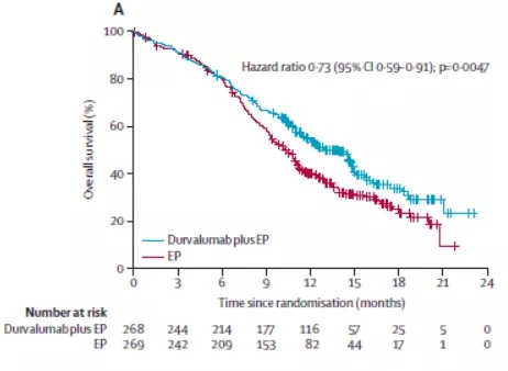 联合Durvalumab组的OS为13.0个月(95% CI: 11.5-14.8个月),单纯化疗组的OS为10.3个月(95% CI: 9.3-11.2个月),差异具有统计学意义(HR=0.73, 95% CI: 0.59-0.91, P=0.0047),;12个月的OS率分别为54%(95% CI: 47.4-59.5%)和40%(95% CI: 33.7-45.8%),预设的18个月OS率为34%(95% CI: 26.9-41.0%)和25%(95% CI: 18.4-31.6%)(图2)。