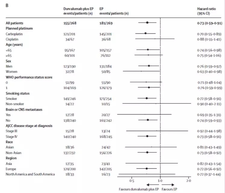 主要分层因素是铂类药物的种类(顺铂或卡铂)。依托泊苷的治疗剂量是80-100 mg/m2(第1-3天给药,每21天一个周期),联合卡铂(AUC=5-6)或顺铂(75-80 mg/m2);Durvalumab的剂量为1500 mg,每3周一次;Tremelimumab的剂量为75 mg/m2,每3周一次。免疫治疗组患者至多接受4周期化疗,然后进行Durvalumab每4周一次的维持治疗,单纯化疗组可给予最多6周期化疗并根据患者实际情况决定是否联合局部放射治疗。