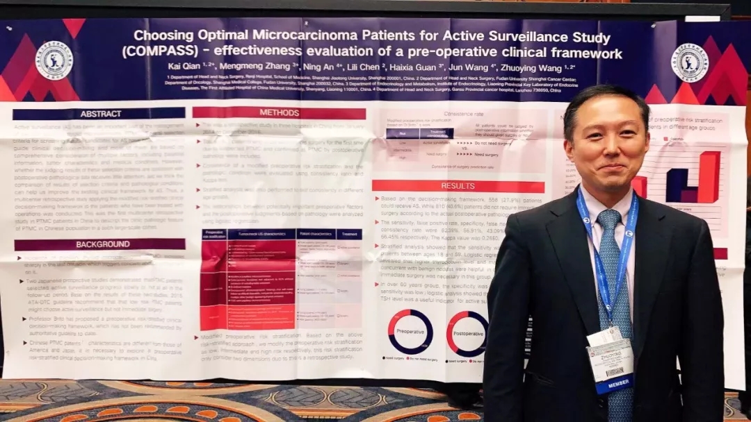 编者按:甲状腺微小乳头状癌(PTMC)在世界范围内发病率逐年上升,且在甲状腺癌病例中占比不断攀升,成为临床焦点和研究热点。2015年ATA甲状腺癌指南推荐“PTMC可暂不手术,但须积极监测”,却未针对此给出具体的筛查方案和随访流程。这一推荐可谓石破天惊、颠覆传统,一时间学术纷争四起。2016年初,美国斯隆凯特琳癌症中心(MSKCC) Brito教授提出了PTMC术前危险分层临床决策框架,以用于筛选理想的PTMC患者进行积极监测。鉴于中国PTMC患者的临床特征及医疗环境等情况可能不同于美国,COMPASS研究应运而生。2019年10月30日~11月3日,美国芝加哥召开的美国甲状腺协会(ATA)年会上,由上海交通大学医学院附属仁济医院王卓颖教授、中国医科大学附属第一医院关海霞教授、甘肃省肿瘤医院王军教授等共同开展的COMPASS研究结果得以公布,并启示PTMC的临床决策。