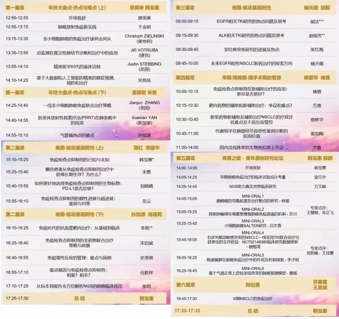 为期两天的会议日程紧密,分设六大章节,分别为肺癌年终大盘点——热点与难点、晚期-驱动基因阴性、晚期-驱动基因阳性、早期/局晚期-围手术期管理、青春之歌——青年原创研究论坛、辩论赛,分别由上海市胸科医院韩宝惠教授、顾爱琴教授、简红教授、姜丽岩教授、储天晴教授、孙加源教授、东部战区总医院宋勇教授、上海市肿瘤医院常建华教授、上海交通大学医学院附属瑞金医院高蓓莉教授、解放军总医院胡毅教授、武汉同济医院褚倩教授、上海市肺科医院苏春霞教授、湖南省肿瘤医院邬麟教授、河南省肿瘤医院王慧娟教授主持。来自世界各地、五湖四海的肺癌领域专家共聚一堂,探讨肺癌领域前沿热点问题,是一场高水准的肺癌诊治学术盛会。