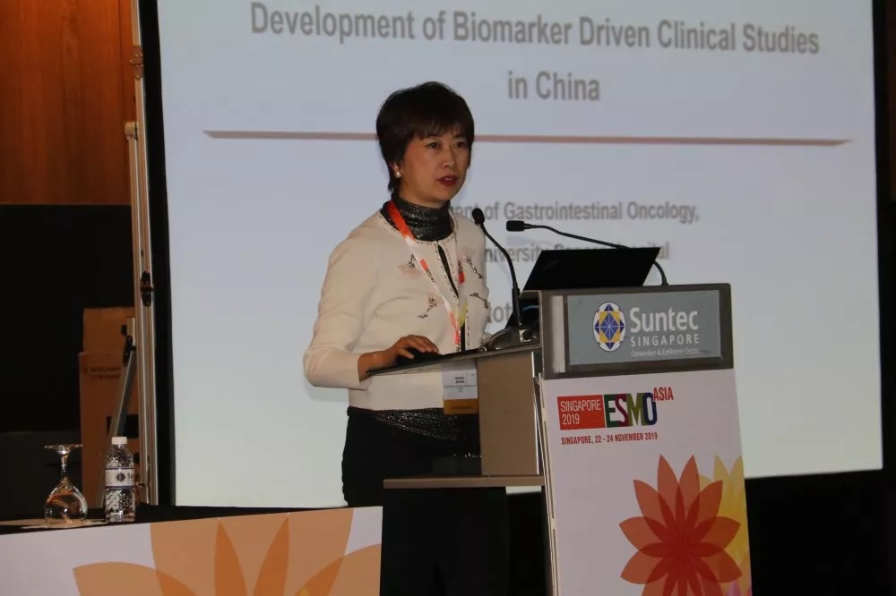 随后,北京大学肿瘤医院张小田教授针对“Development of biomarker driven clinical studies in China”的主题进行了深入的阐述及解读。张教授首先介绍了中国肿瘤临床研究的分布现状,并以胃癌(GC)为例详细介绍了HER2+、RC48-ADC等biomarkers的研究进展。最后,她指出中国在肿瘤临床试验的开展上具有诸多优势及挑战,其中优点主要包括:潜在患者数量多(人口超过13亿)、招募患者快速、发现新突破机会多等。而同时也存在重复性研究多、缺乏明确的前期数据作支撑等挑战。