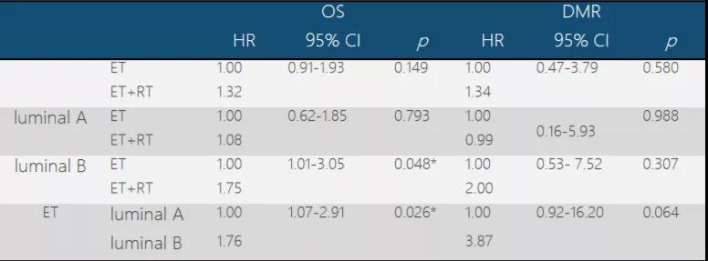 ET组和ET+RT组的5年OS差异无统计学意义(P=0.149)。ET组的10年预测OS率为30.0%,ET+RT组为50.0%,差异无统计学意义(HR=1.10,95%CI 0.69-1.75;P=0.691 )。在luminal A型中,ET组和ET+RT组之间的5年OS率无显著差异(P=0.793)。在luminal B型中,ET组和ET+RT组之间的5年OS率有显著差异(HR=1.75,95%CI,1.01-3.05;P= 0.048)。在ET组中,luminal A型和luminal B型在5年OS率方面存在显著差异(HR=1.76,95%CI 1.07-2.91;P=0.026)。