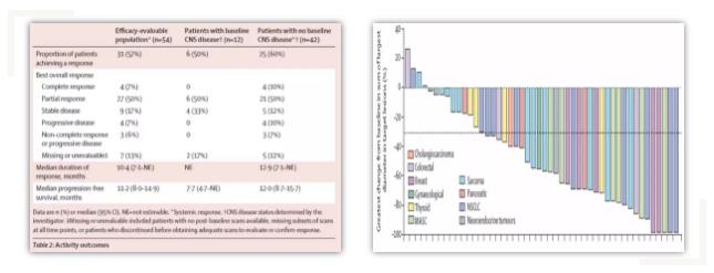 患者的ORR为57%(7%评估为CR,50%评估为PR),DCR为67%。携带NTRK1和NTRK3融合的患者,其ORR相似,分别为59%和58%,1例携带NTRK2融合的患者接受Entrectinib治疗后疗效评估为SD,缓解深度为-2%。