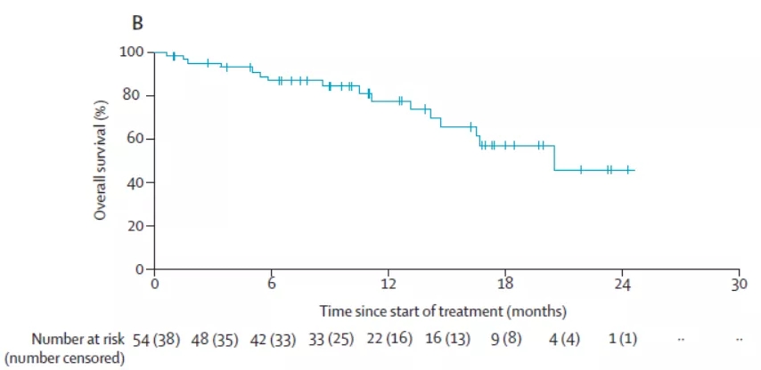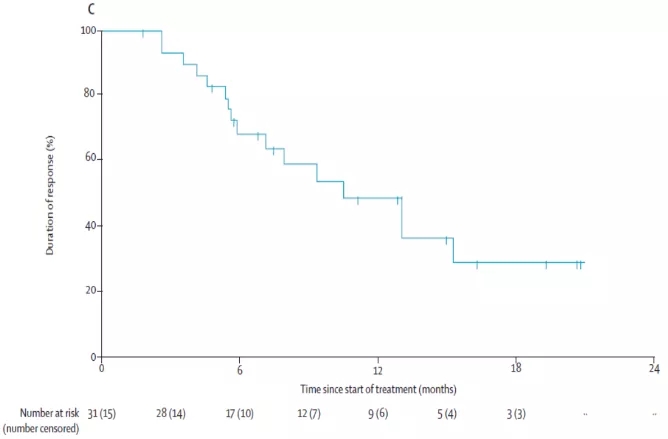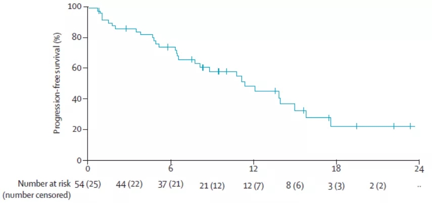 患者中位缓解持续时间为10.0个月。末次随访时,分别有29例和16例患者出现疾病进展或死亡,患者中位PFS及OS分别为11.0个月和21.0个月(图3)。