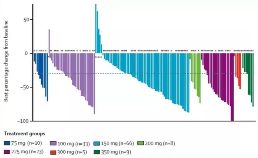 该研究中,尽管最大耐受剂量并未出现,但任何级别的皮疹及3度以上皮疹发生率随着治疗剂量的提高而提高,而超过200mg的治疗剂量可导致70%的患者出现皮疹。150mg剂量组显示了良好的耐受性,且患者的ORR达到50%,理论模型预测150mg剂量组可比低剂量组提供更加稳定的血药浓度,基于这些原因,后续治疗Nazartinib的推荐剂量为150mg,片剂,口服,每日一次。在接受该推荐剂量治疗时,7%的患者因皮疹导致剂量降低。
