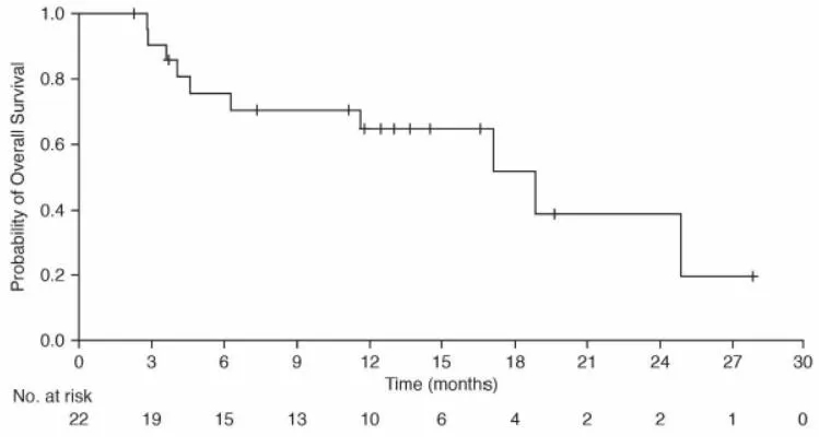 中位OS为18.8个月(95% CI: 6.3–不能计算),6个月、12个月及18个月的OS率分别为76%、65%和52%。