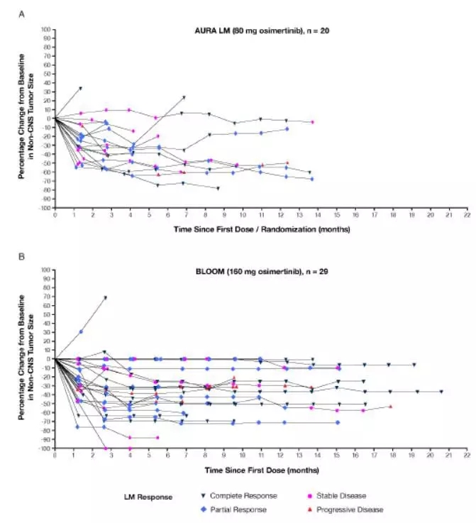 图4. AURA LM研究 (80 mg qd)和BLOOM研究(160 mg qd)中患者的脑膜转移反应和纵向non-CNS肿瘤大小