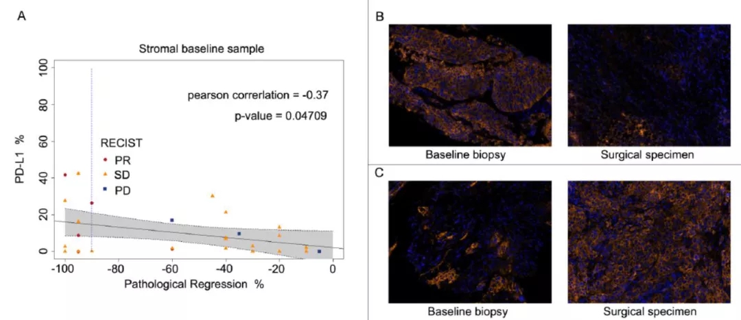 研究中,18例患者原发灶与转移淋巴结的反应不一致。分别有32例和37例患者有术前、术后组织进行PD-L1表达水平检测,PD-L1表达阳性及阴性患者均有出现主要病理学缓解的病例,基线原发灶基质细胞PD-L1表达水平与原发灶病理学缓解程度有关(Pearson correlation= -0.37, p=0.0471),PD-L1表达水平较高的患者肿瘤退缩更加明显。未观察到原发灶及术后病灶的PD-L表达水平存在相关性(图3)。