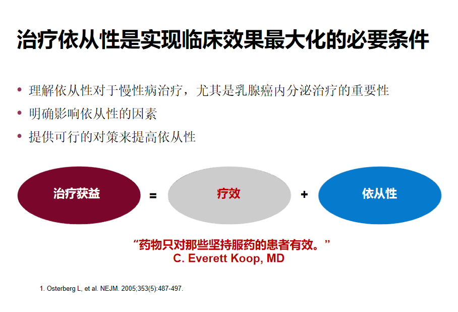 小结:治疗依从性对患者的最终临床获益有直接影响,而不良反应管理是提高内分泌治疗依从性的重要内容,尤其是血脂异常等心血管事件、骨质疏松和骨痛等骨健康相关事件;此外,治疗全程中应注意和患者保持良好的沟通,给予一定的心理支持。